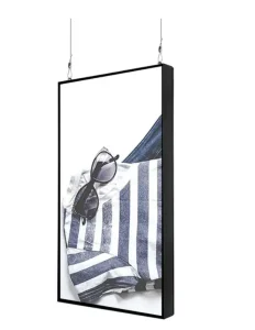 Disseny elegant tipus tauleta amb marc d’alumini i cristall temperat. Ideal per a comerços, centres comercials i restauració.